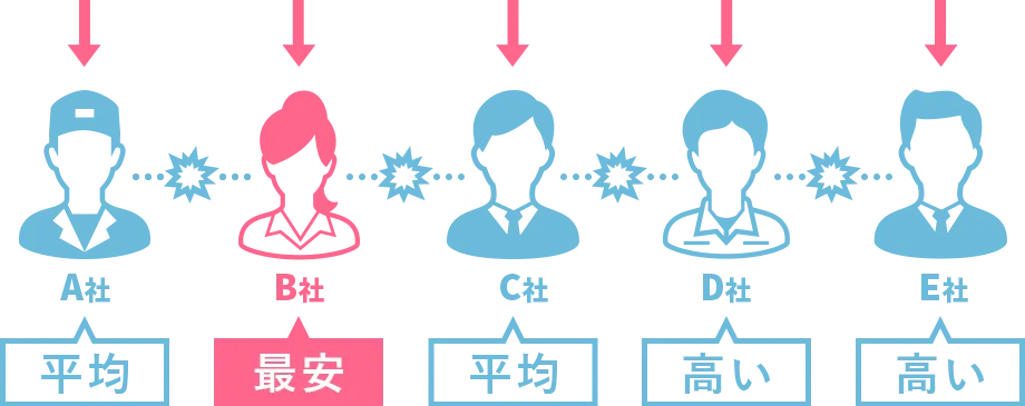 お客様の見積が同時に複数業者へ行くので業者は依頼を獲得するため互いに競争します。